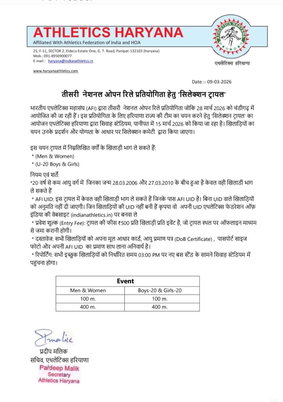 Final Results 35th Haryana State Athletics. update 15-10-2022.pdf Size : 755.103 Kb Type : pdf |
